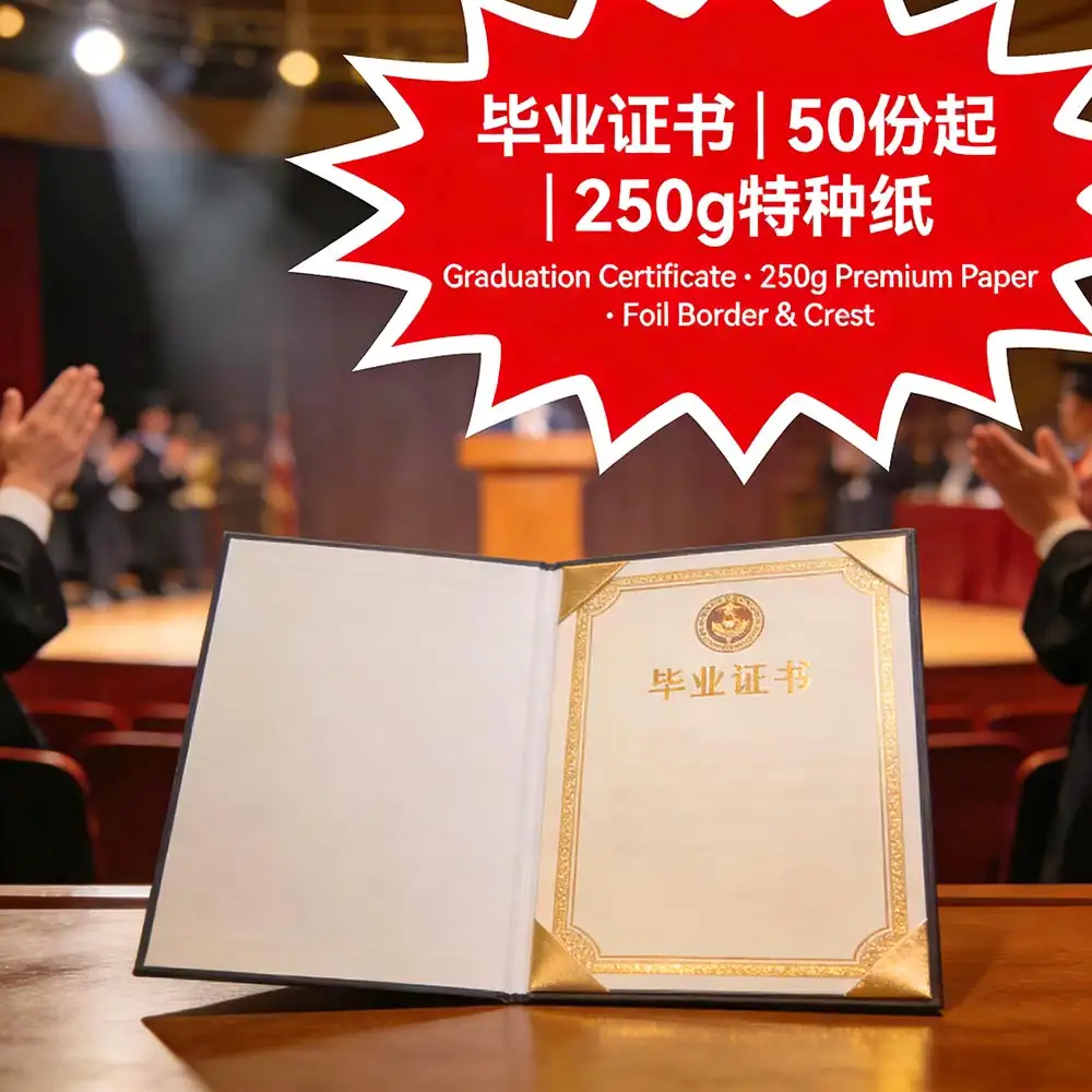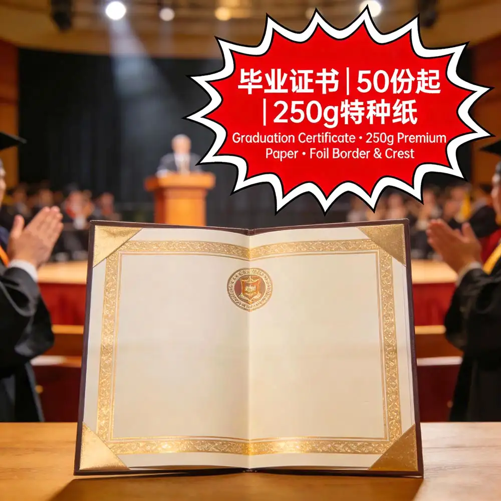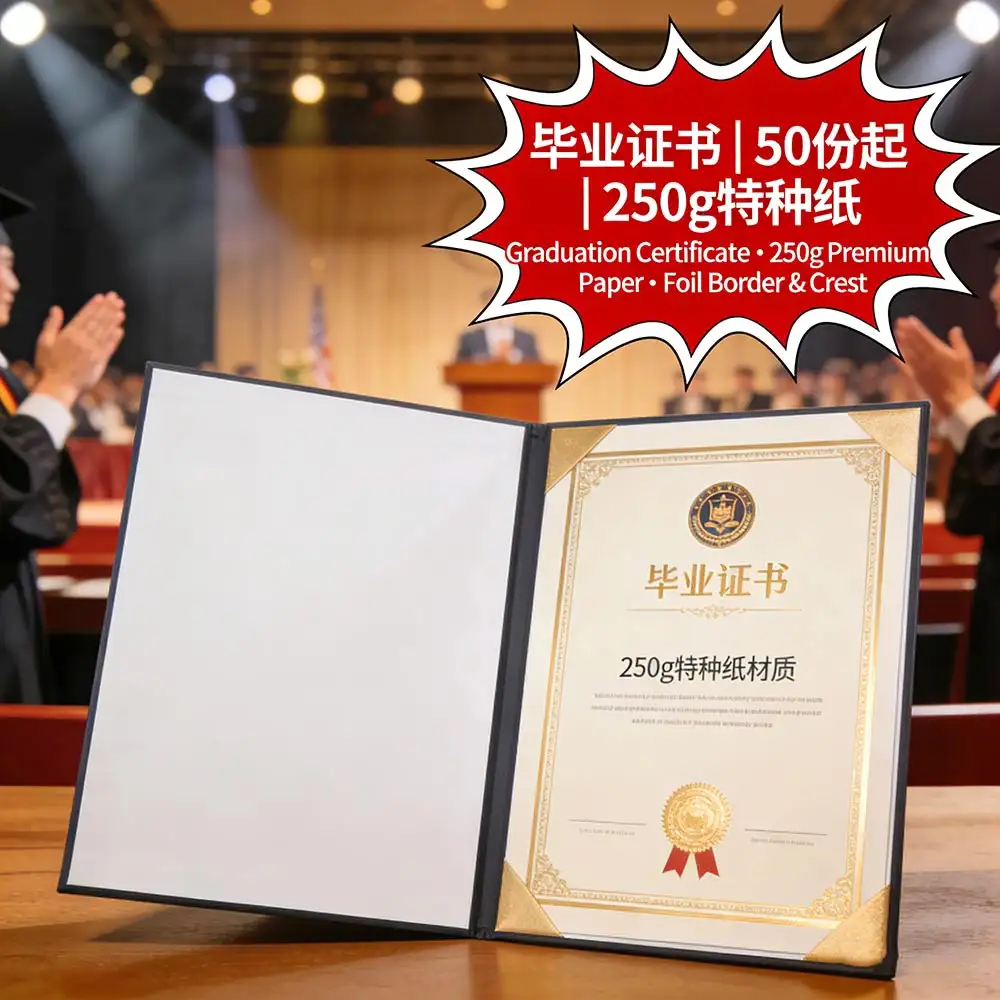 採用250g高級特種紙,燙金邊框與校徽,50份起印,支持即日取件,符合學校正式頒發標準,適用中學及小學畢業典禮。