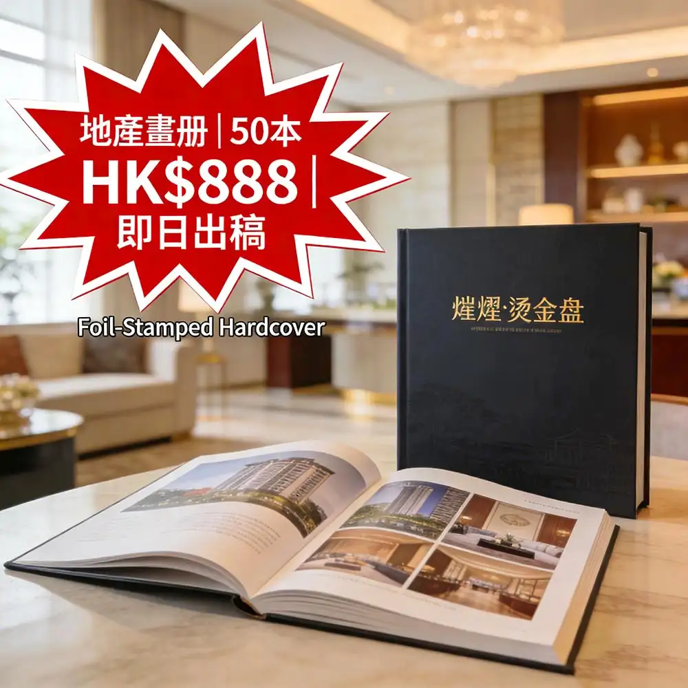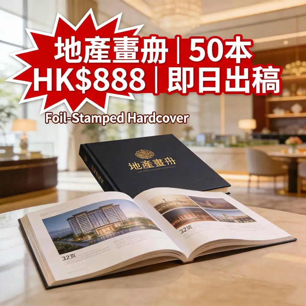 企业画册:A4精装+烫金,100本HK$688起|地产画册:A4+硬壳+烫金封面,50本HK$888起|婚礼画册:精装烫银+相片修图,20本HK$588起|产品目录:厚页胶装,100本HK$988起|学校成果册:校徽嵌入,50本HK$488起
