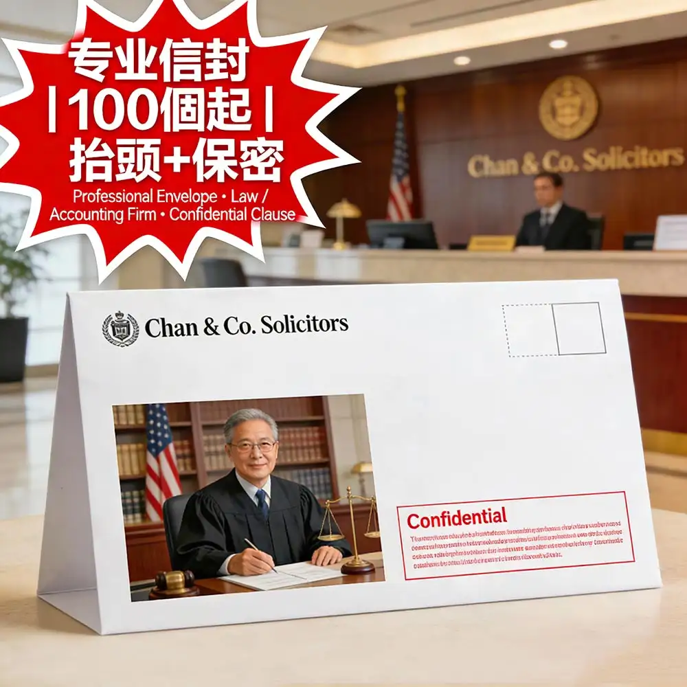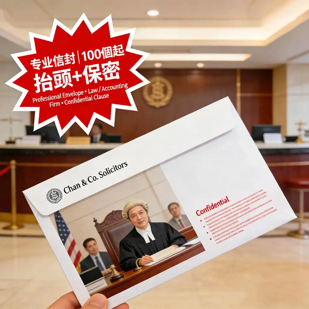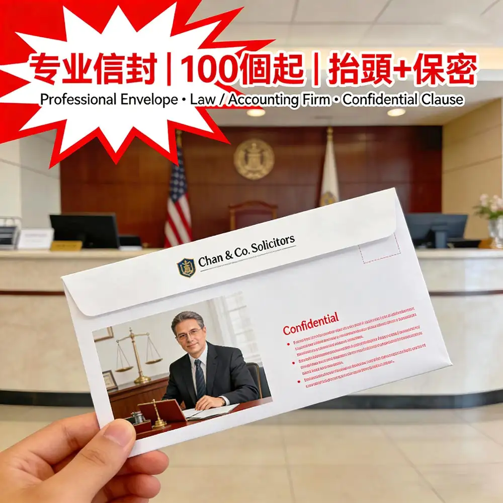 專為律師樓、會計事務所、審計機構及專業服務公司設計的專業服務信封,嚴格預留公司抬頭位置,支援加印「保密文件」法律條款,採用國際標準C6 (114×162mm)尺寸,完美容納A4三折頁文件,最低100個起印,確保每一封寄出的信函皆符合行業規範與客戶對專業形象的期待。更多詳情儘在智印港提供的專業信封印刷服務。