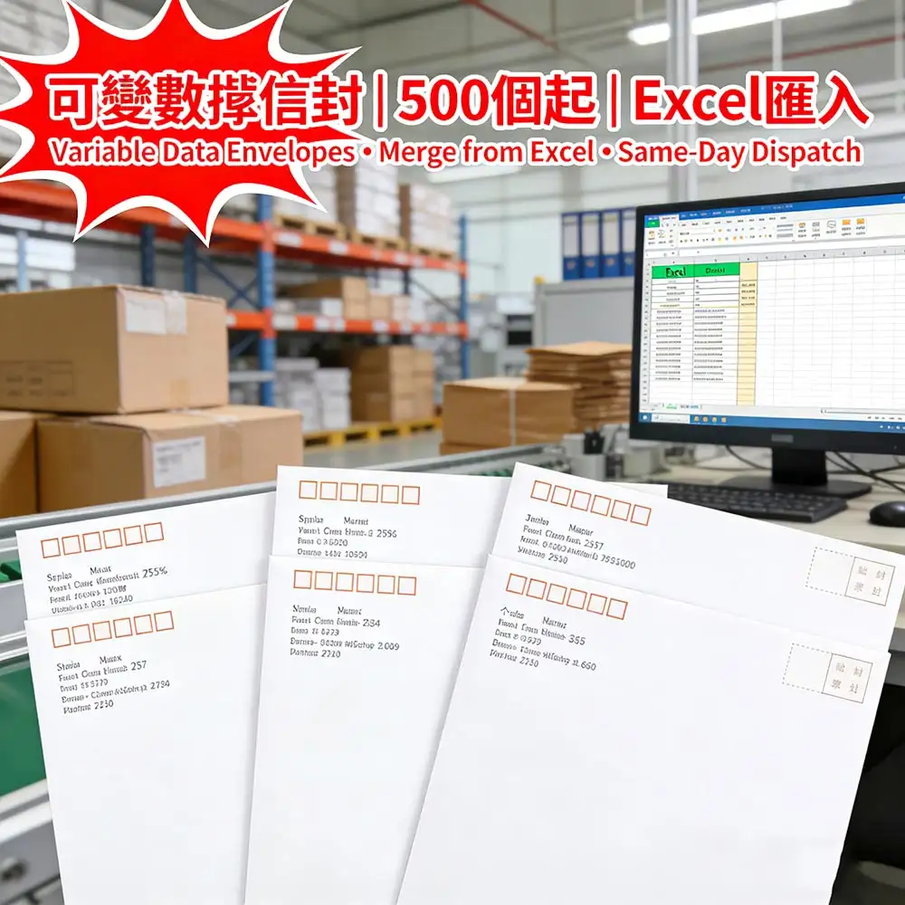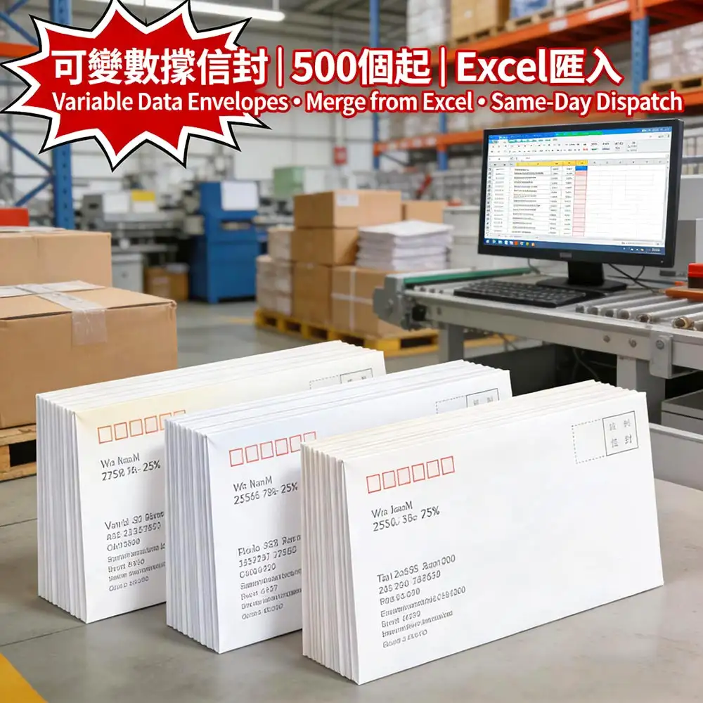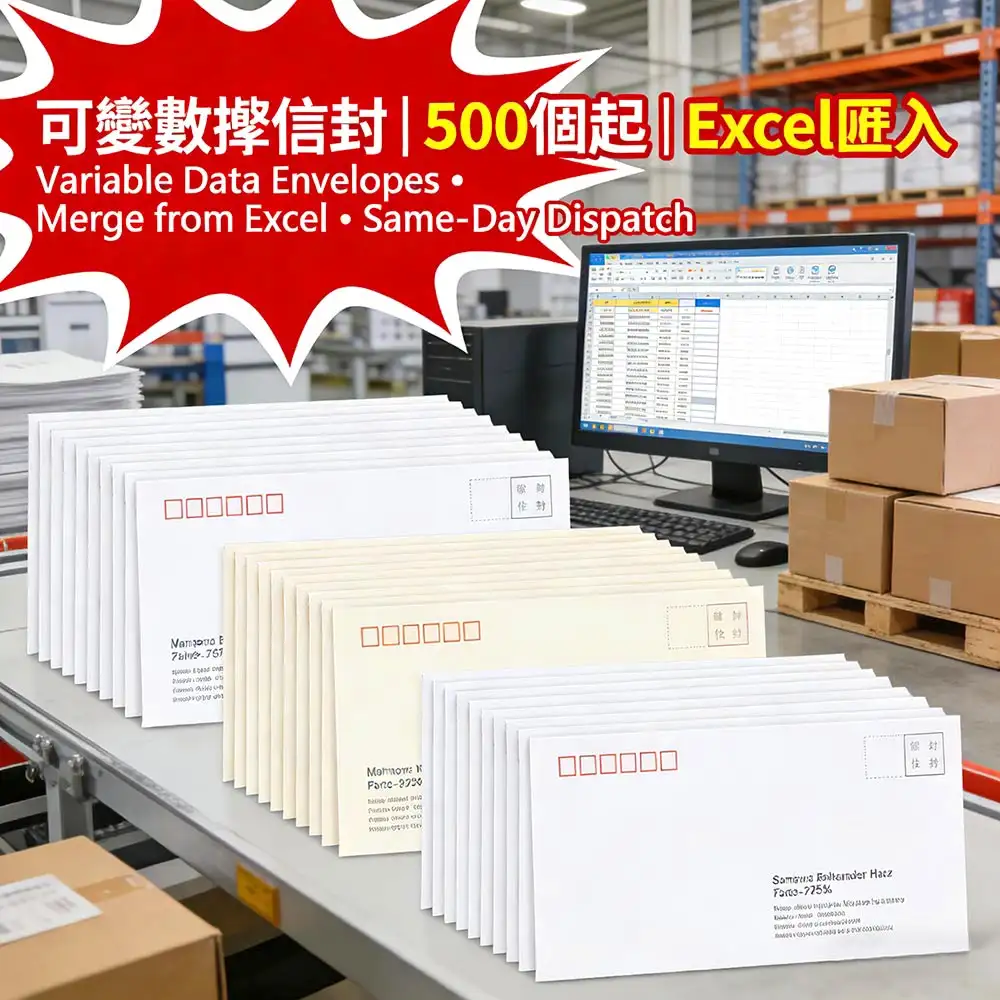 專為企業直郵、會員通知與市場推廣打造的可變數據信封印刷服務,支援Excel數據一鍵匯入,自動生成個性化收件人地址,最低500個起印,確認數據後當日出貨,錯誤率低於0.1%。更多詳情儘在智印港提供的專業信封印刷服務。