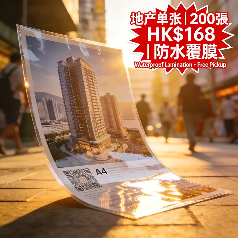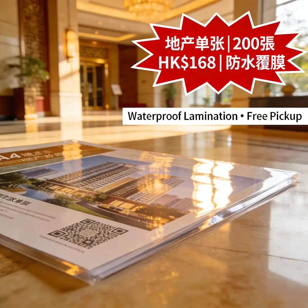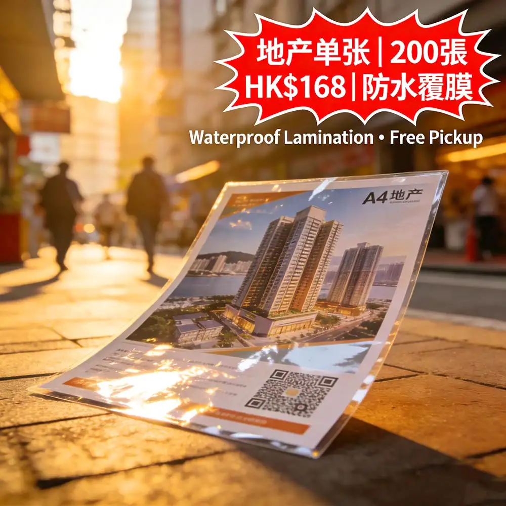 香港地產代理專屬高效推廣方案:A4 (210×297mm) 雙面全彩放盤單張,200張僅需 HK$168(比市場便宜 25%),採用高級防水覆膜工藝,抗污、防刮、耐潮,戶外展示不褪色。由深圳ISO9001認證智能工廠直供,支援稿件確認後最快 24小時內完成印刷,並透過全港順豐直送送達分行、展銷點或活動現場,無需自取,省時省力。