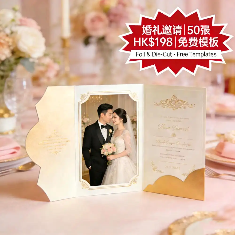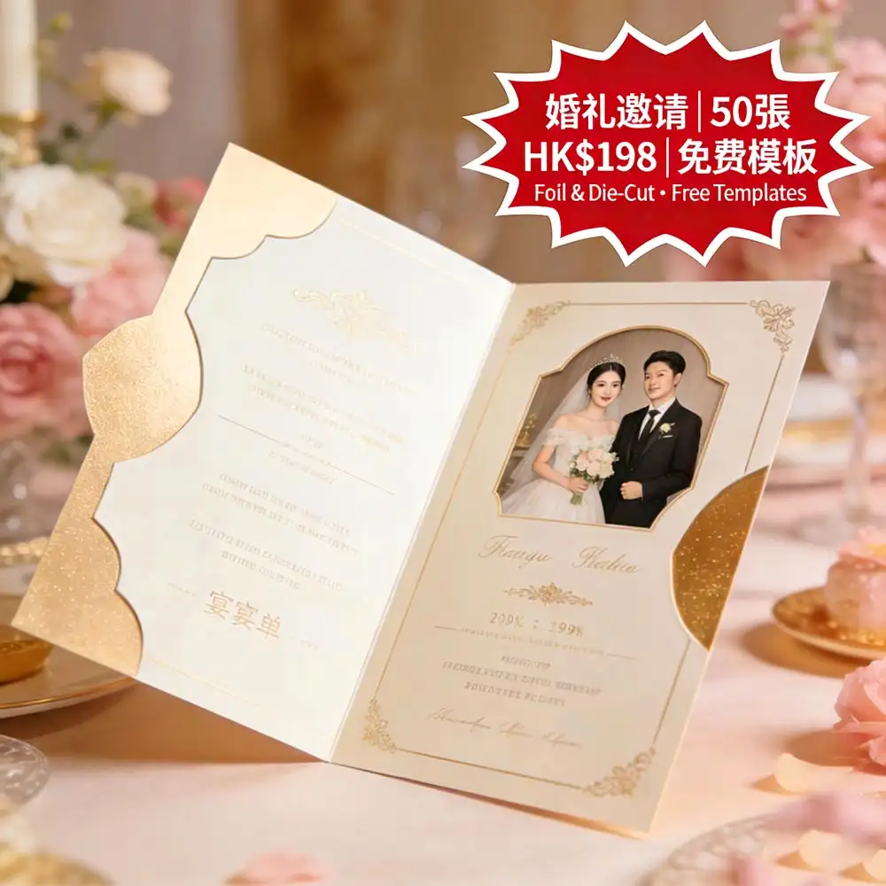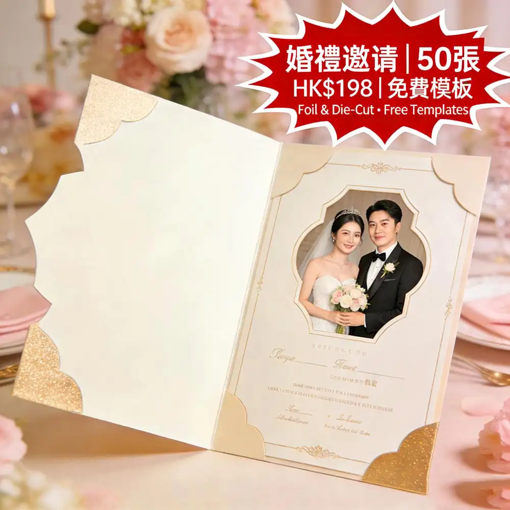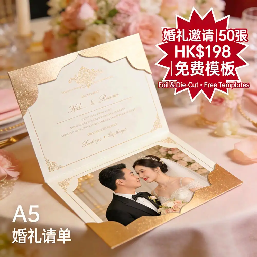 香港新人打造夢幻婚禮的第一步:A5 (148×210mm) 雙面全彩婚禮邀請單張,支援真金/銀/玫瑰金燙金工藝+異形裁切(圓角、心形、波浪邊),50張僅需 HK$198(比市場便宜 30%)!我們提供多款免費精緻模板,新人只需填入姓名、日期與地點,即可快速客製。由深圳ISO9001認證高端印刷工廠直供,採用德國海德堡設備精準還原燙金細節,稿件確認後最快 24–48小時內完成生產,並透過全港順豐直送安全送達您手中——無需奔波印刷店,也能擁媲美國際品牌的婚禮邀請。