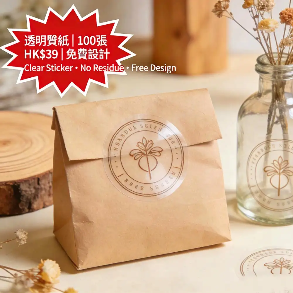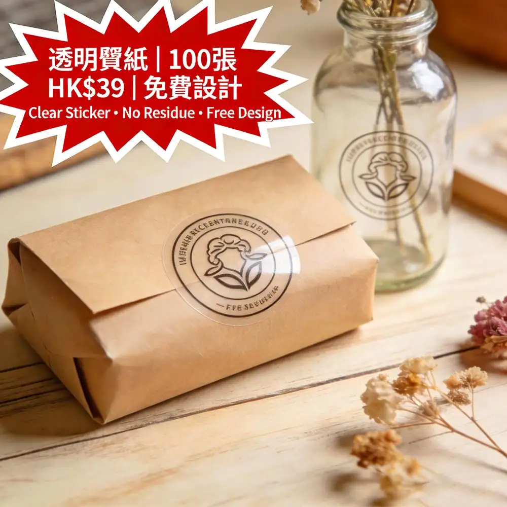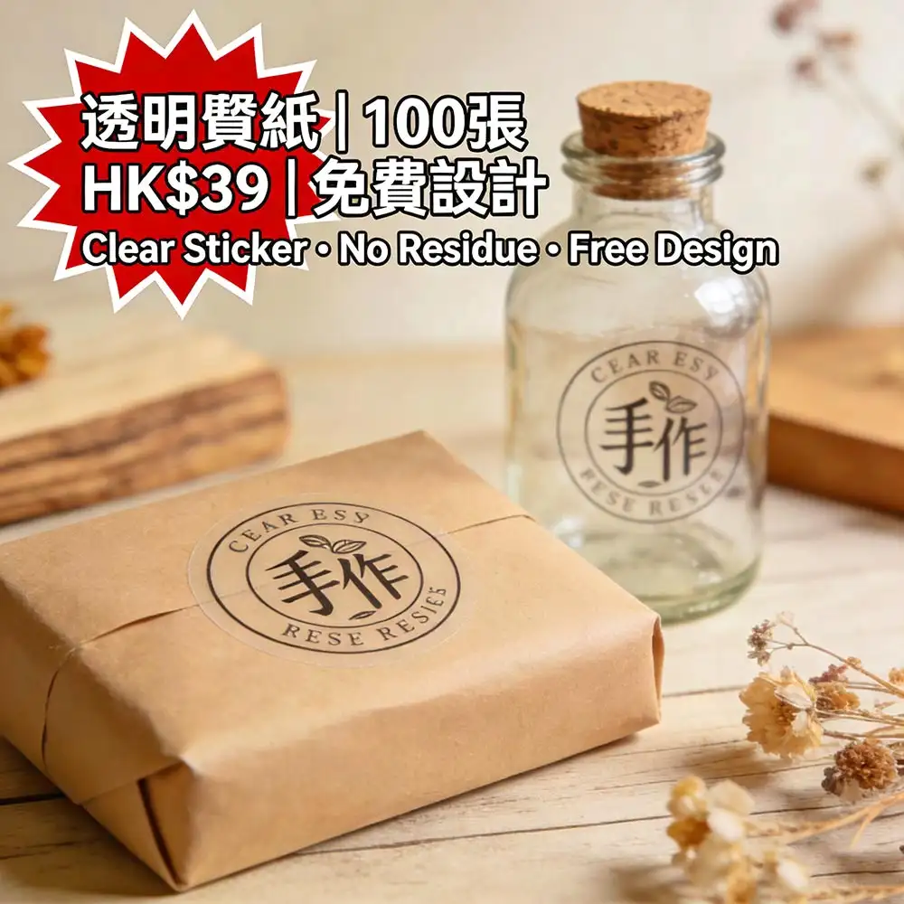 香港手作品牌與電商賣家的高端包裝首選:採用高透光 PET 不干膠材質(透光率 >90%),支援無邊框裁切技術,貼上後幾乎看不見邊界,完美呈現 LOGO 與圖案。撕除時完全不留膠、不損表面,適用於玻璃瓶、塑膠罐、手工皂、護膚品等曲面容器。100張僅需HK$39(HK$0.39/張起),並享價值 HK$150 的免費專業設計服務。由深圳ISO9001認證工廠直供,稿件確認後最快1–2個工作天完成印刷,透過全港順豐直送安全送達——讓您的商品包裝瞬間提升質感與專業度。