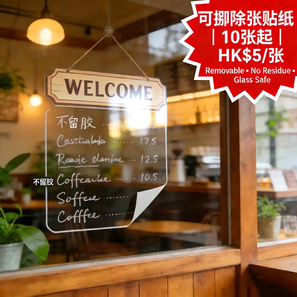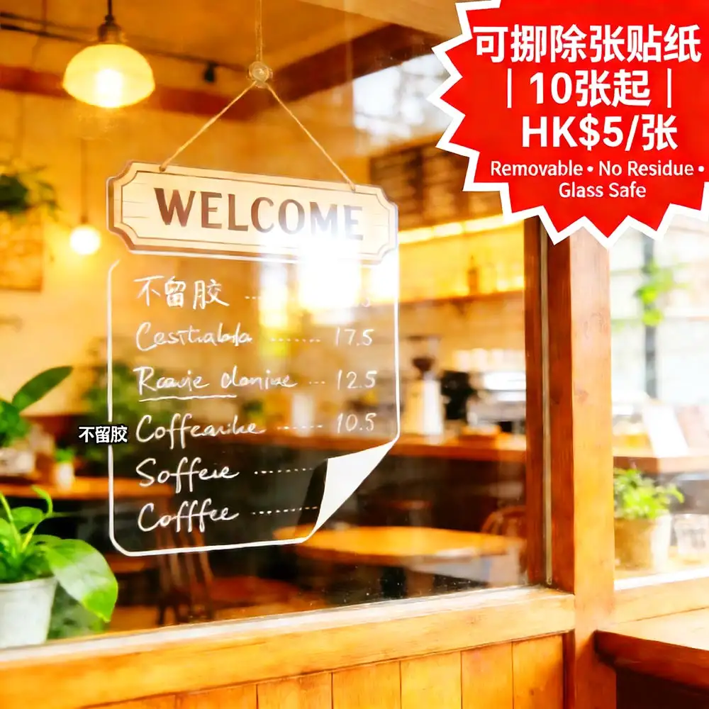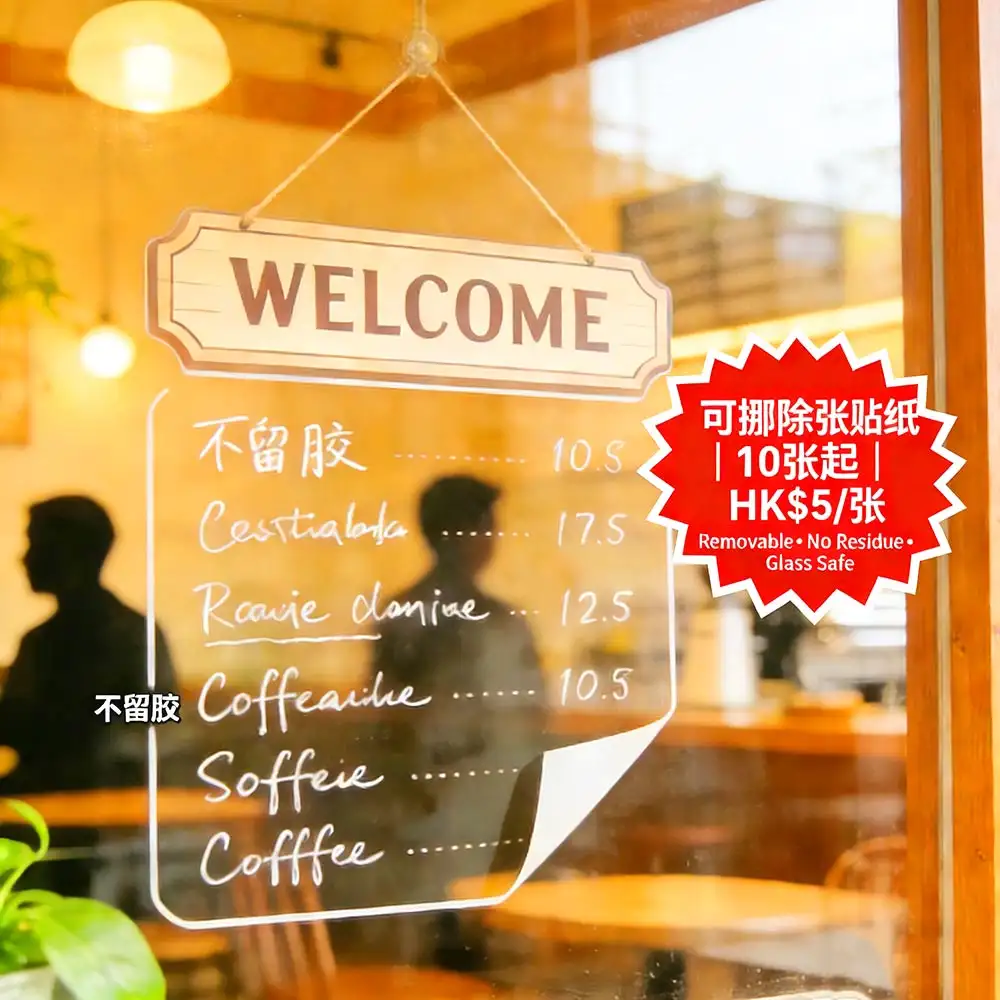 香港咖啡店、美容院與婚禮策劃的短期佈置首選:採用高透 PET 膜 + 進口可移除壓克力膠,黏貼牢固卻能輕鬆撕下,完全不留殘膠、不損表面。適用於玻璃窗、磁磚牆、金屬門及光滑漆面,完美打造迎賓牌、價目表、營業時間或婚禮指引標示。僅需10張起印,每張HK$5,並享價值 HK$120 的免費 PSD 模板(含迎賓牌/價目表/營業時間三款設計)。由深圳ISO9001認證工廠直供,稿件確認後最快1–2個工作天完成,透過全港順豐直送安全送達——讓您的空間佈置靈活又專業。