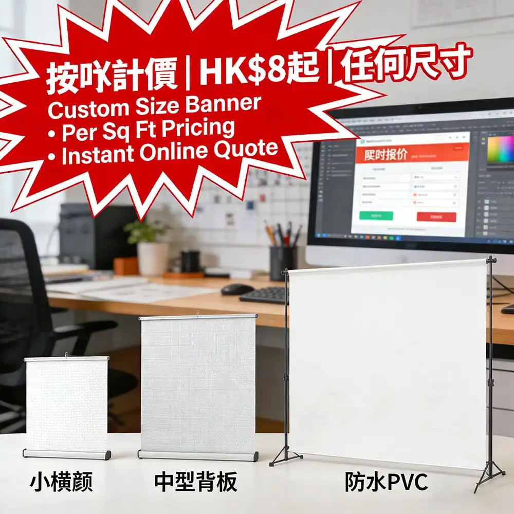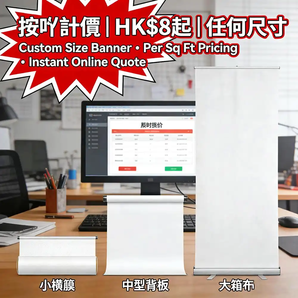 按平方呎计费:HK$8-15/呎(依材质而定)|标准套餐:A0/A1室内喷绘HK$68起|6×3ft即日取喷绘HK$8/呎起|店铺开业横额+地贴套餐HK$299起|在线即时报价,透明无隐藏费用
