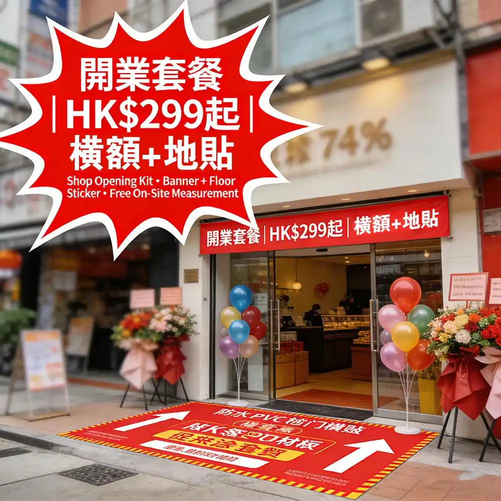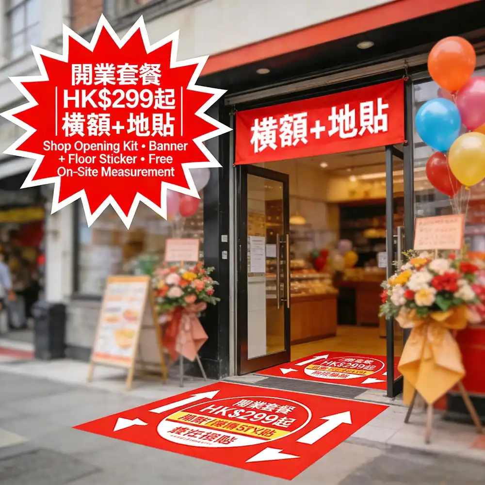 店铺开业:门口横额+地贴组合|防水PVC材质|HK$299起|免费上门测量+设计