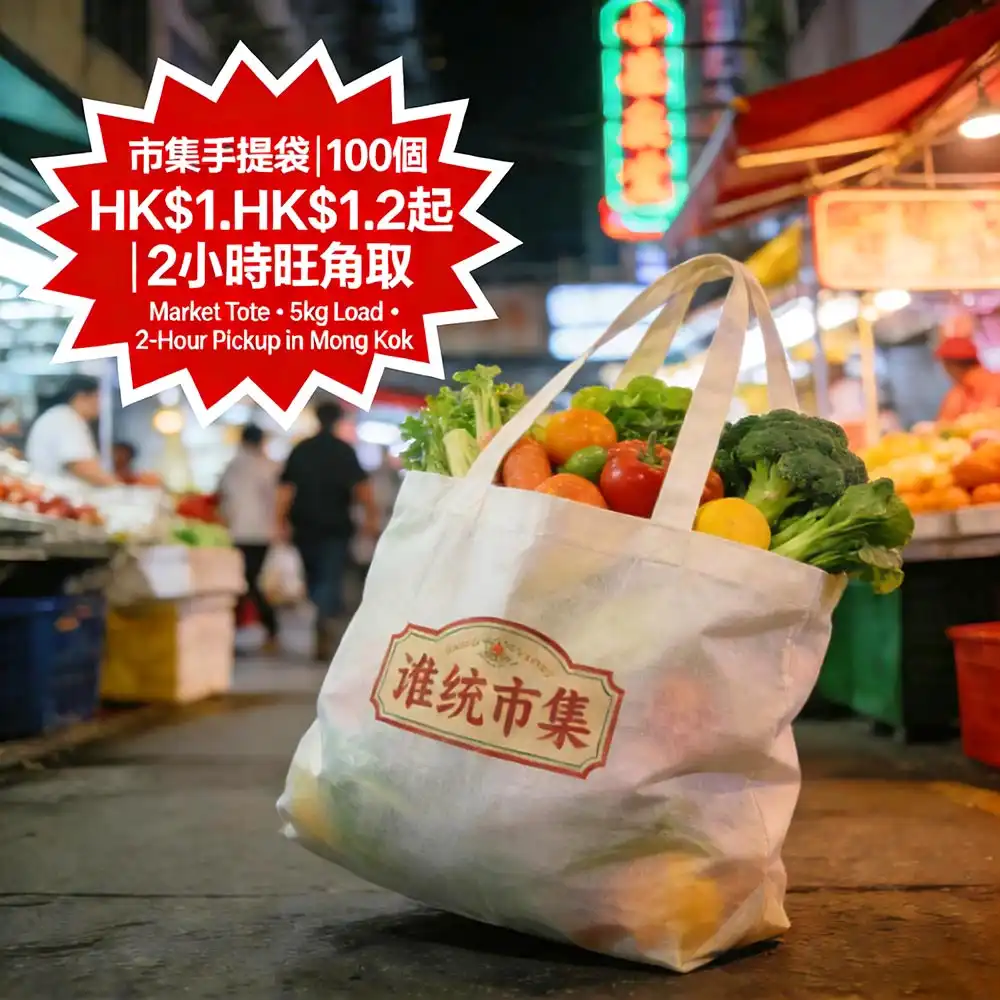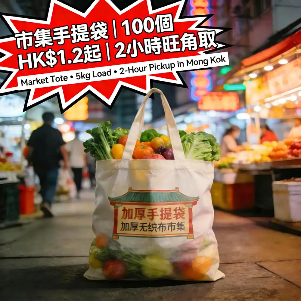 市集袋:加厚无纺布|承重5kg|旺角2小时急件取货|100个起,HK$1.2起|适合夜市、市集摊主