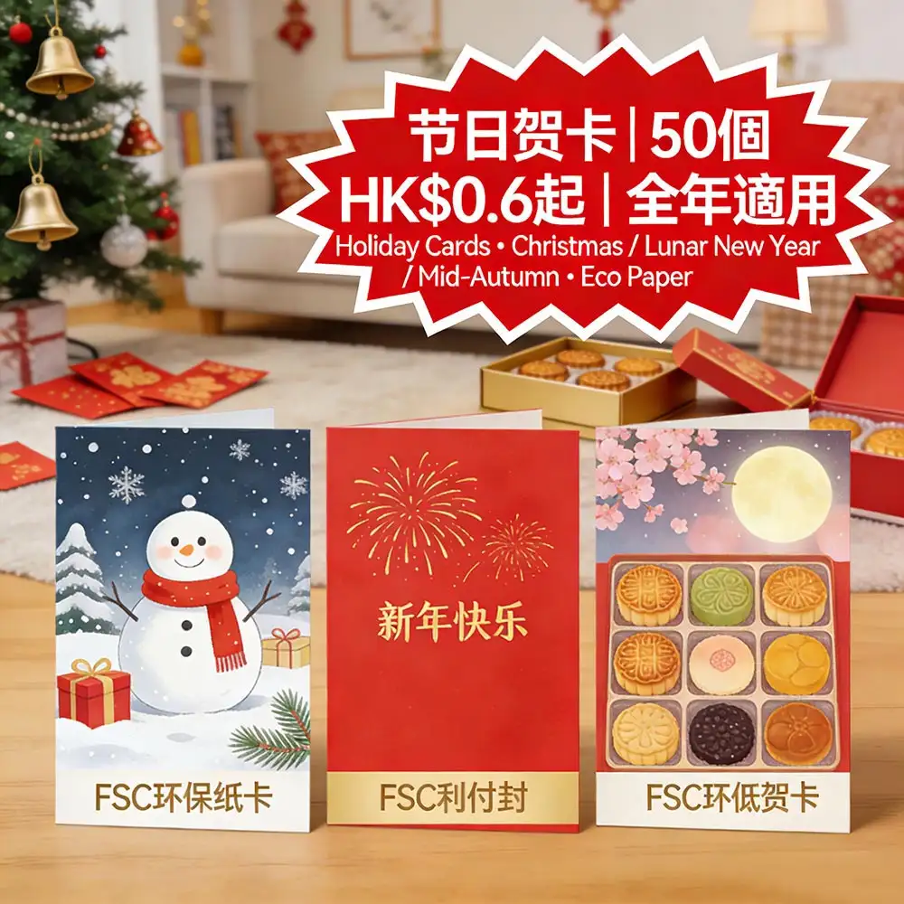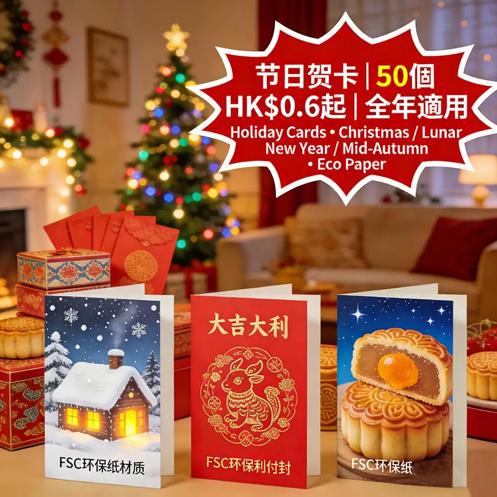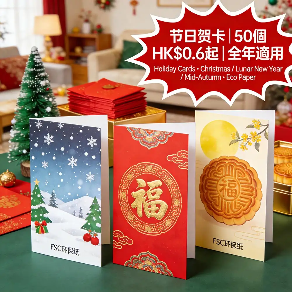 通用贺卡:圣诞+新年+中秋多场景适用|50个起印|HK$0.6起单价|可定制祝福语